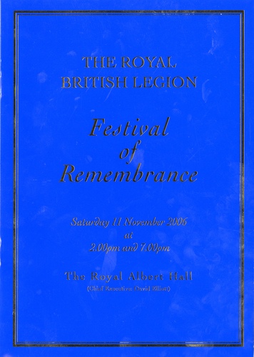 | Set List | 'Organ Prelude' (Peter Crompton), 'Fanfare' (State Trumpeters of the Household Cavalry), Musical Selection and Community Singing (The Massed Bands of the Guards Division, Festival Chorus), 'God Save the Queen' (The National Anthem), Entry of Union Flag and The Royal British Legion National Standards, followed by (Sea Cadet Corps Standard, Combined Cadet Corps Banner, Army Cadet Force Banner, Air Training Corps Banner), The Torch of Remembrance (Alex Sibony), The Festival Citation (Brigadier John Palmer), 'Anthem' from Chess (James Fox, Katherine Jenkins) Representative Standards of The Royal British Legion, Ex-Service Associations and Civilian Services Standard Bearers: Royal Naval Association; Royal Marines Assoication; Royal Air Forces Association; Association of Wrens; Aden Veterans Association; National Malaya & Borneo Veterans Association; The Aircrewmans Association; Air Transport Auxiliary Association; Ulster Defence Regiment; Royal Ulster Constabulary GC Foundation; Civil Defence Association, The Merchant Navy, In-Pensioners from the Royal Hospital Chelsea, War Widows, Band of HM Royal Marines, Portsmouth, The Queen's Colour Squadron of The Royal Air Force, 'This Song For You', Chris de Burgh, The Band and Dancers of The Brigade of Gurkhas, Eightieth Birthday Tribute to Her Majesty The Queen - 'All These Years', Geoff Stephens (Katherine Jenkins), The Muster: The Royal Navy; Queen Alexandra's Royal Naval Nursing Service; The Royal Marines; The Royal Naval Reserve; The Royal Marines Reserve; The Royal Fleet Auxiliary; The Royal Maritime Auxiliary Service; Worcestershire and Sherwood Foresters Regiment (29th/45th Foot); Queen's Gurkha Officers; Queen Alexandra's Royal Army Nursing Corps; The Territorial Army; The Royal Irish Regiment; The Royal Air Force; The Royal Air Force Regiment; Servicewomen of the Royal Air Force; Royal Air Force Police; Princess Mary's Royal Air Force Nursing Service; The Royal Auxiliary Air Force; The Royal Air Force Volunteer Service Civilian Services: St John Ambulance; St Andrew's Ambulance Association; British Red Cross Society; Royal National Lifeboat Institution; YMCA; Special Constabulary; Royal Star and Garter Home The Royal British Legion - at work: Poppy Appeal Collectors; Royal British Legion Welfare; Royal British Legion Industries; Legion Group plc, Laying Up of The Drums and The Book of Remembrance, 'In Flanders Fields', Geoff Stephens (Nicky Spence), The Book of Remembrance (Captain Peter Norton GC), Service: Procession (Cross Bearer, Choir from the Royal Hospital School, Holbrook, The Reverend Scott Brown, The Reverend Cole Maynard, The Reverend John Walsh, The Reverend Hugh Bearn Chaplain to the Bishop, The Right Reverend Nigel McCulloch Bishop of Manchester, National Chaplain to The Royal British Legion), 'God is Love: Let Heav'n Adore Him', The Bidding Prayer (National Chaplain to The Royal British Legion), 'Make Me a Channel of Your Peace', All Angels, The Lesson - 1 Corinthians Chapter 13 (William Roache MBE), The Prayers (Service Chaplains - The Reverend Scott Brown, Royal Navy, The Reverend Cole Maynard, Royal Army Chaplains Department, The Reverend John Walsh, Royal Air Force), 'O Lord My God, When I in Awesome Wonder', The Act of Remembrance, The Last Post, The Exhortation (Air Marshal Ian Macfadyen), We Will Remember Them, Poppy Petals Fall, Reveille, The Dedication (Rochelle Gianfrancesco from Gordon's School), Gratitude of the Young (Poppies presented by children from Montgomery Junior School, Colchester), Ever-living God (Tom Sherman), 'Abide With Me' Sunset, The Blessing, 'God Save the Queen' (The National Anthem) |