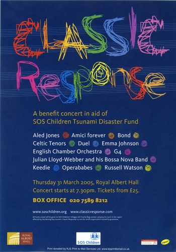 | Set List | 'Prometheus Overture' (English Chamber Orchestra), Introduction (Aled Jones, Jamie Crick), 'Flower Duet' (Opera Babes), 'Prendero quell Brunettino' (Opera Babes), 'Adagio from Mozart Clarinet Concerto' (Emma Johnson), 'Non Siamo Isole' (Celtic Tenors), 'Danny Boy' (Celtic Tenors), 'La Wally' (Keedie), 'Time to Say Goodbye' (Keedie), SOS Film, Bond, 'How Great Thou Art' (Aled Jones), 'Suo-Gan' (Aled Jones), 'The Look of Love' (Julian Lloyd-Webber & His Bossa Nova Band), 'Pagan Samba' (Julian Lloyd-Webber & His Bossa Nova Band), INTERVAL 'Variations on a Theme of Paganini' (Cassie Yukawa & Rosey Chan), 'Questa O Quella' (Jon Christos), 'Immenso Sogno' (Jon Christos), 'Hungarian Dance Number 5' (Duel), 'Ashokan Farewell' (Duel), SOS Film, 'Albinoni's Adagio for Strings' (Amici Forever), 'The Prayer' (Amici Forever), 'Jerusalem' (G4), 'Bohemian Rhapsody' (G4), 'Panis Angelicus' (Russell Watson), 'Nessun Dorma' (Russell Watson), 'Ave Maria' (Harry Sever) |