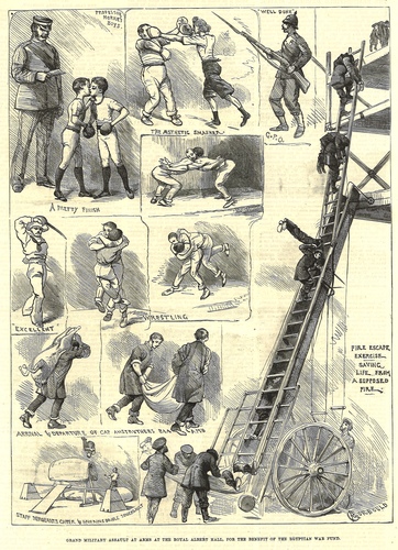| Performance Notes | "Precisely at half past two the programme opened with the lance exercise, which was gone through brilliantly by a squad from the Cavalry Depot, Canterbury, and this was followed in turn by gymnastics feats, bayonet exercise by the Marines, cavalry sword exercise by the Royal Horse Guards, the working of the Nordenfelt machine gun by the seaman and gunners of Her Majesty's ship Excellent, boxing, fire-escape practices, fencing, cutlass and broard-sword exercise, gun practise, singlestick, and wrestling and a tug of war between boys from Her Majesty's training ship St Vincent and boys from the Woolwich garrison concluded a most interesting assault-at-arms, which excited the utmost interest in the spectators." (The Times, 18 April 1883) |