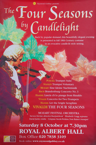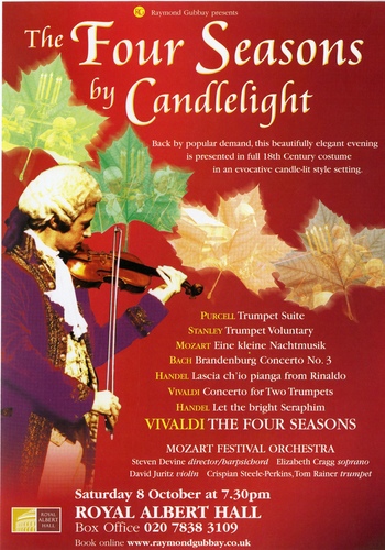 | Set List | 'Brandenburg Concerto No.3 in G Major', Bach, 'Eine Kleine Nachtmusik', Mozart, 'Lascia Ch'io Pianga', Rinaldo, Handel (Elizabeth Cragg), 'Trumpet Suite', Purcell, 'Trumpet Voluntary', Stanley, 'Let the Bright Seraphim' from Samson, Handel (Elizabeth Cragg), 'Concerto for Two Trumpets in C Major', Vivaldi (Tom Rainer, Crispian Steele-Perkins) INTERVAL 'The Four Seasons Op.8 Nos. 1-4', Vivaldi (David Juritz) |