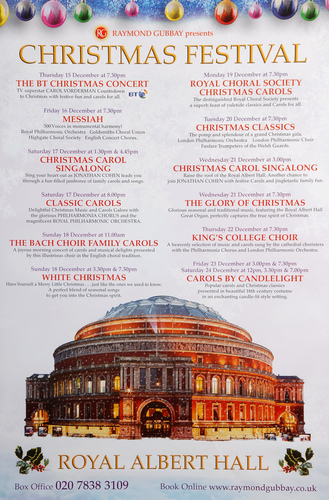| Set List | 'Joy to the World', Mason, arr. Cullen, 'O Come, All Ye Faithful', Wade, arr. Willcocks, 'Sussex Carol', arr.Willcocks, 'Air on the G String', Bach, 'O Holy Night', Adam, arr. Rutter, 'I Wonder As I Wander', arr. Sadin, 'The Little Road to Bethlehem', Head, 'For Unto Us a Child is Born' from The Messiah, Handel, 'Prelude' from Te Deum, Charpentier, arr. Steele-Perkins, 'Trumpet Concerto (Last movement)', Haydn, 'Panis Angelicus', Franck, 'Good King Wenceslas', arr. Jacques, 'Masters in This Hall', arr. Willcocks INTERVAL 'Zadok the Priest', Handel, 'God Rest You Merry, Gentlemen', arr. Willcocks, 'The Holly and the Ivy', arr. Rutter (New London Children's Choir), 'Musical Sleigh Ride', Leopold Mozart, 'The Shepherd's Farewell', Berlioz, 'In Dulci Jubilo', Pearsall, 'Toccata', Widor, 'The Holy City', Adams, 'Once in Royal David's City', Gauntlett, arr. Willcocks, 'O Little Town of Bethlehem', arr. Vaughan Williams, 'Hark! The Herald Angels Sing', Mendelssohn, arr. Willcocks |