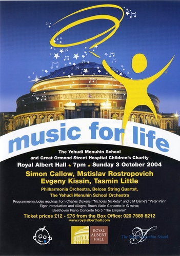 | Set List | Welcome and Introduction (Simon Callow), 'Introduction and Allegro for Strings, Op.47', Elgar (The Yehudi Menuhin School Orchestra, The Belcea Quartet, Past pupils of the School), 'Nicholas Nickleby or "Who Calls So Loud?"', Charles Dickens, Stephen Oliver, text: David Edgar (Simon Callow, Philharmonia Orchestra), 'Violin Concerto No.1, Op.26 in G Minor', Bruch (Tasmin Little, Philharmonia Orchestra) INTERVAL 'Peter Pan or "The boy Who Wouldn't Grow Up"', JM Barrie, Stephen Oliver, text: John Caird (Simon Callow, Philharmonia Orchestra), 'Piano Concerto No.5, Op.73 in E Flat Major, "The Emperor", Beethoven (Evgeny Kissin, Philharmonia Orchestra) |