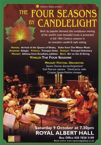 | Set List | Arrival of the Queen of Sheba' from Solomon, Handel (Mozart Festival Orchestra), Adagio in G Minor for Organ and Strings', Albinoni, Giazotto (Mozart Festival Orchestra), Alleluia (Exsultate, Jubilate)', Mozart (Gail Pearson, Mozart Festival Orchestra), Trumpet Suite', Purcell (Crispian Steele-Perkins, Mozart Festival Orchestra), Trumpet Voluntary', Stanley (Crispian Steele-Perkins, Mozart Festival Orchestra), Air on the G String', Bach (Mozart Festival Orchestra), Let the Bright Seraphim' from Samson, Handel (Gail Pearson, Mozart Festival Orchestra), Water Music Suite', Handel (Mozart Festival Orchestra) INTERVAL The Four Seasons Op.8 Nos.1-4', Vivaldi (David Juritz, Mozart Festival Orchestra) |