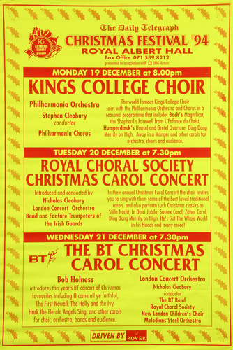 | Set List | 'Magnificat in D Major', Bach (Gillian Webster, Teresa Shaw, John Graham-Hall, Dean Robinson, King's College Choir, Philharmonia Chorus, Philharmonia Orchestra), 'Sussex Carol', arr. Willcocks, 'Away in a Manger', arr. Cleobury, 'The Holly and the Ivy', arr. Walford Davies, 'Quittez, Pasteurs', arr. Cleobury, 'Joys Seven', arr. Cleobury, 'I Saw Three Ships', arr. Preston, 'In the Bleak Mid-Winter', Darke, 'A Babe is Born', Matthias INTERVAL 'Overture' from Hansel and Gretel, Humperdinck (Philharmonia Orchestra), 'L'enfance du Christ' (Part II), Berlioz, 'Christmas Day', Holst, 'Once in Royal David's City', trad., 'While Shepherds Watched', trad., 'Hark! The Herald Angels Sing', Mendelssohn |