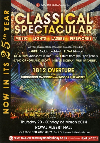| Set List | 'March of the Toreadors', Bizet, 'Zadok the Priest', Handel, 'Stars and Stripes', Sousa, 'Canon in D', Pachelbel, 'Soldier's Chorus', Gounod, 'Waltz from Swan Lake', Tchaikovsky, 'Duet from The Pearl Fishers', Bizet, 'Rhapsody in Blue', Gershwin, 'Pomp and Circumstance March No.1', Elgar INTERVAL 'Finale from Organ Symphony', Saint Saens, 'Largo al Factotum', Rossini, 'Recondita Armonia', Puccini, 'Nimrod', Elgar, 'Hornpipe' from Fantasia on British Sea Songs, Wood, 'Rule, Brittania!', Arne, 'Nessun Dorma', Puccini,' '1812 Overture', Tchaikovsky (with cannons and indoor fireworks) |