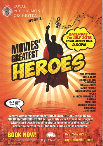 Double-sided leaflet advertising Royal Philharmonic Orchestra performances - 'Playstation In Concert - World Premiere' and 'Movies' Greatest Heroes'' at the Royal Albert Hall