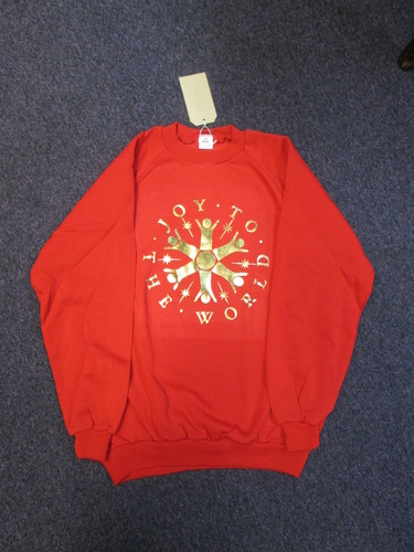 Extra Large red sweater with gold lettering and 'Joy To The World' logo.