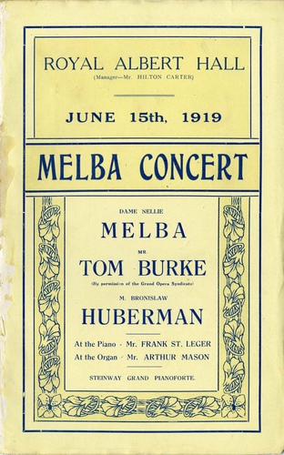 | Main Performers | Dame Nellie Melba, Mr Tom Burke - vocals, M Bronislaw Huberman - violin |