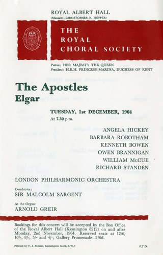 | Set List | 'God Save the Queen' (The National Anthem), arr. Elgar, 'The Apostles', Elgar (Angela Hickey, Barbara Rowbotham, Kenneth Bowen, Owen Brannigan, William McCue, Richard Standen, Arnold Greir, Royal Choral Society, London Philharmonic Orchestra) |