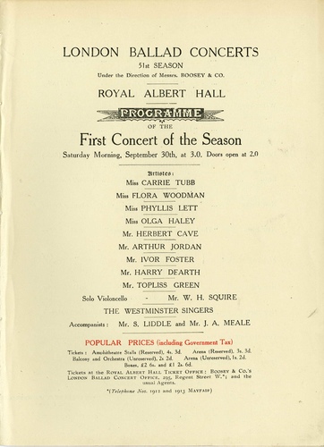 | Main Performers | Carrie Tubb, Flora Woodman, Phyllis Lett, Olga Haley, Herbert Cave, Arthur Jordan, Ivor Foster, Harry Dearth, Topliss Green - vocals, W H Squire - violoncello, J A Meale - organ |