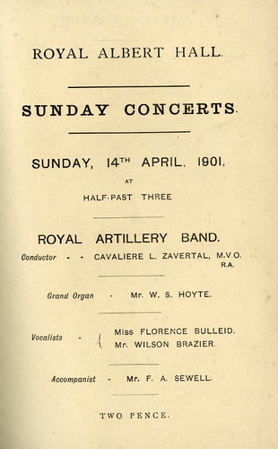 | Main Performers | Miss Florence Bullied, Mr Wilson Brazier - vocals, Mr W S Hoyte - organ |
