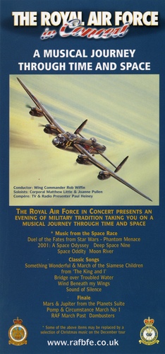 | Set List | '2001 - A Space Odyssey', R Strauss, J Strauss, arr. R K Wiffin, 'Semper Fidelis', J P Sousa, 'The Old March of the Ukrainian Cossacks', Zaporozsky, 'Something Wonderful', Rodgers and Hammerstein, arr. D Richards (Joanne Pullen), 'Space Oddity', Bowie, arr. I Bertoff, 'Black Orpheus', Luiz Bonfa, arr. R K Wiffin (Junior Technician Neslihan 'Hurrell), 'Stardust', Carmichael, arr. Steve Rockey (Chief Technician Geoff Lawrence, Corporal Gary Wyatt), 'Moon River', Mancini, Mercer, arr. R K Wiffin (Corporal Matthew Little), 'Fanfare for the Common Man', Copland, 'Finale from Symphony No.5', Shostakovitch, arr. Righter INTERVAL 'Deep Space Nine', D McCarthy, arr. D Richards, 'Songs of Simon', P Simon, arr. R K Wiffin, 'Hocus Pocus', P Wayman, 'Tiptoe Tune', I Bertoff, 'The Wind Beneath My Wings', Silbar, Henley, arr. R K Wiffin (Joanne Pullen), 'Duel of the Fates', J Williams, FINALE 'Fanfare for a Festival', Arnold, arr. McDermott, 'The Dam Busters March', E Coates, 'The Planets', Holst, arr. H B Hingley, 'Pomp and Circumstance March No. 1', Elgar, 'The Royal Air Force (RAF) March Past', Davies, Dyson |