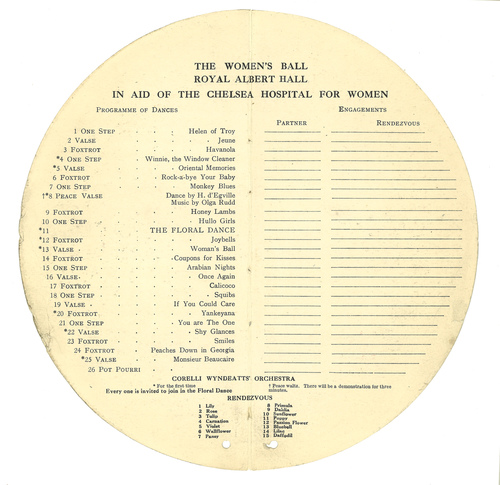 | Performance Notes | "...The Albert Hall has been transformed into a garden of flowers. An enormous basket of them, 24 feet long, stands in the centre. Roses woven out of 70,000 roses and 100,000 sprays of asparagus fern are slung from the dome forming streamers in every direction. The arc of lamps are swathed inflowers, and very box is a bower. ...Flower names mark the rendezvous, which are as follows: 1. Lily 2.Rose 3. Tulip 4. Carnation 5. Violet 6.Wall Flower 7. Pansy 8. Primula 9. Dahlia 10. Sunflower 11. Poppy 12. Passion Flower 13. Blue Bell 14. Lilac 15. Daffodill" Many ladies have chosen dreses to represent flowers, and a number of men will don masks and Venetian capes. The new "Peace Walk" will be shown to-night fo rthe first time, and Lady Alexander and Baroness Percy de Worms have arranged twenty couples to lead it." (The Daily Telegraph, 1919)