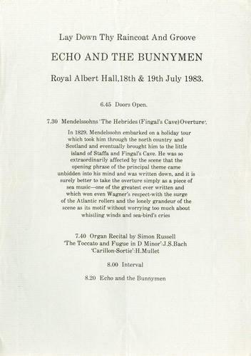| Orchestra or Band | Echo and the Bunnymen (Ian McCulloch - vocal, Will Sergeant - guitar, Les Pattinson - bass guitar, Pete de Freitas - drums) |