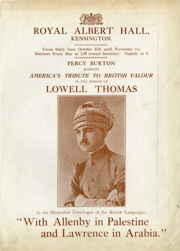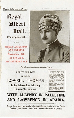 Performance TitleAmerica's Tribute to British Valour in the Person of Lowell Thomas in His Marvellous Moving Picture Travelogue - 'With Allenby in Palestine and Lawrence in Arabia'