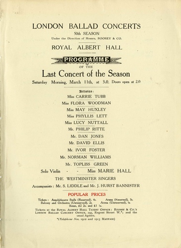 | Set List | Organ Solo ( J Hurst Bannister), 'The Sweetest Flower', Robert Batten (Topliss Green), New Song: 'Gleaming Shells', Fennell Bruce (Flora Woodman), 'Daffodil Song', Haydn Wood (Flora Woodman), 'Megan', Ivor Novello (Philip Ritte), Part-Song: 'O Peaceful Night', Edward German (The Westminster Singers), 'The Glory of the Sea', Wilfrid Sanderson (Phyllis Lett), Violin Soli: 'Berceuse', Tor Aulin (Marie Hall) 'Fugue', Tartini (Marie Hall), 'Loveliest of Trees' (A Shropshire Lad), Arthur Somervell (Ivor Foster), 'When I Was One-and-Twenty' (A Shropshire Lad), Arthur Somervell (Ivor Foster), New Song: 'The Awakening of Sweet William', Grace Watson (Carrie Tubb), 'All Joy Be Thine', Wilfrid Sanderson (David Ellis), 'Deep In My Heart', T Wilkinson Stephenson (Lucy Nuttall), 'Friend O' Mine', Wilfrid Sanderson (Norman Williams), New Song: 'Love's Golden Morrow', Amy Woodforde-Finden (May Huxley), 'Roses', Stephen Adams (Dan Jones) INTERVAL Humorous Quartet: 'The Patriotic Fowl', arr. Wilfred Kearton (The Westminster Singers), 'My Old Shako', H Trotere (Topliss Green), New Song: 'Mavis', Harold Craxton (Philip Ritte), New Song: 'Song of the Homeland', Gerald Grayling (Phyllis Lett), Violin Soli: 'Canzonetta', d'Ambrosio (Marie Hall), 'Moto Perpetuo', Novacek (Marie Hall), New Song: 'A New Little Visitor', Harold Samuel (Ivor Foster), 'Break O' Day', Wilfrid Sanderson (Carrie Tubb), 'Sea Wrack', Hamilton Harty (Lucy Nuttall), 'Strike Up A Song', Merlin Morgan (Norman Williams), 'Bird of Love Divine', Haydn Wooa (May Huxley), 'The Enchanted Glade', Lois Barker (Dan Jones), Part-Song: 'The Piccaninny's Lullaby', Macy (The Westminster Singers) |