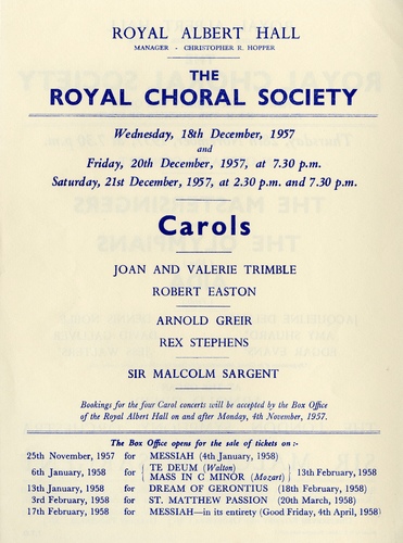 | Set List | 'God Save the Queen' (The National Anthem) arr. E Elgar, 'Adeste Fideles' (Royal Choral Society), 'Now Once Again Our Hearts We Raise' (Royal Choral Society), 'Christmas Song', M Praetorius (Royal Choral Society), 'The Boar's Head Carol', arr. Sargent (Royal Choral Society), 'Siciliano' (Sonata No.2 For Flute and Cembalo), Bach, arr. Cohen (Joan and Valerie Trimble), 'Sheep May Safely Graze', Bach, arr. Howe (Joan and Valerie Trimble), 'Christians, Awake', J Wainwright (Royal Choral Society), 'Gloria', G P Da Palestrina (Royal Choral Society), 'Wassail Song', arr. Vaughan Williams (Royal Choral Society), 'Welcome, Yule!', H Parry (Royal Choral Society), 'The Cradle in Bethlehem', R Quilter (Robert Easton, Rex Stephens), 'Shepherd's Cradle Song', Somervell (Robert Easton, Rex Stephens), 'Christmas Chimes', B Hamblen (Robert Easton, Rex Stephens), 'To A Baby', arr. Sargent (Royal Choral Society), 'On Christmas Day', arr. Sargent (Royal Choral Society), 'A Cowboy Carol', arr. Sargent (Royal Choral Society), 'Jerusalem', Parry (Royal Choral Society), 'Hark! The Herald Angels Sing', Mendelssohn (Royal Choral Society), 'Christ in His Garden', Tchaikovsky (Royal Choral Society), 'The Coventry Carol' (Royal Choral Society), 'Christmas is Coming', arr. W Davies (Royal Choral Society), 'Rise Up, Shepherd, And Follow', arr. F Robinson (Robert Easton, Rex Stephens), 'Sister Mary Had-A But One Child', arr. R Hayes (Robert Easton, Rex Stephens), 'The Virgin Mary Had A Baby Boy', arr. H Evans (Robert Easton, Rex Stephens), 'Little Jack Horner', Diack (Robert Easton, Rex Stephens), 'Away In A Manger', W J Kirkpatrick (Royal Choral Society), 'The Twelve Days of Christmas', arr. L Young (Royal Choral Society), 'Romance', Rachmaninoff (Joan and Valerie Trimble), 'Waltz' (Suite No.2), Rachmaninoff (Joan and Valerie Trimble), 'Silent Night', arr. Sargent (Royal Choral Society), 'Good King Wenceslas' (Royal Choral Society), 'Ring Out, Wild Bells', P E Fletcher (Royal Choral Society), 'The First Nowell' (Royal Choral Society) |