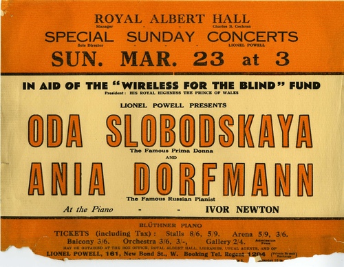 | Set List | Piano Soli: 'Pastorale et Capriccio', Scarlatti-Tausig (Ania Dorfmann) Piano Soli: 'Traumerei', Schumann (Ania Dorfmann) Piano Soli: 'Widmung', Schumann-Liszt (Ania Dorfmann) Piano Soli: 'Ecossaises', Beethoven (Ania Dorfmann) Piano Soli: 'Rondo Capriccioso', Mendelssohn (Ania Dorfmann) Arias: 'Monologue et Air ''Iphigenie En Tauride'', Gluck (Oda Slobodskaya) Arias: 'Mio Caro Bene' (Rodelinde), Handel (Oda Slobodskaya) Piano Soli: 'Impromptu In A Major', Chopin (Ania Dorfmann) Piano Soli: 'Two Valses In A Flat Major', Chopin (Ania Dorfmann) Piano Soli: 'Nocturne In D Flat Major', Chopin (Ania Dorfmann) Piano Soli: 'Valse ''Fledermaus'', Strauss arr.Grunefeldt (Ania Dorfmann) Russian Songs: 'Was Not I Once A Tender Blade That Sprung?', Tchaikovsky (Oda Slobodskaya) Russian Songs: 'Whether By Day', Tchaikovsky (Oda Slobodskaya) Russian Songs: 'So Soon Forgotten', Tchaikovsky (Oda Slobodskaya) Russian Songs: 'Gopak', Moussorgsky (Oda Slobodskaya) |