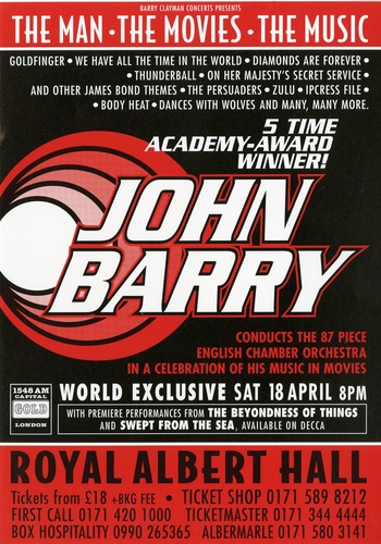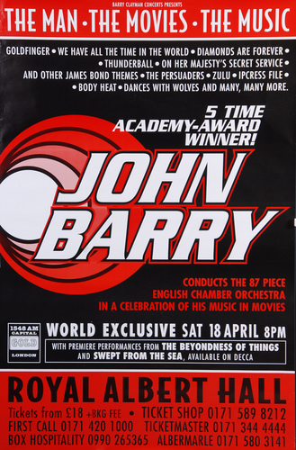 | Set List | 'Goldfinger', 'We Have All The Time In The World', 'Zulu', 'Somewhere In Time', 'Moviola', 'The Persuaders', 'Mary, Queen of Scots', 'Midnight Cowboy', 'Amy Foster - Suite (American Title ''Swept From The Sea'')', 'Dances With Wolves - Suite' INTERVAL 'Born Free', 'All Time High', 'Out Of Africa', 'Body Heat', 'Chaplin', 'Space March (You Only Live Twice)', 'The Ipcress File', 'The Knack', 'The Beyondness of Things - Suite', 'The James Bond - Suite' |
