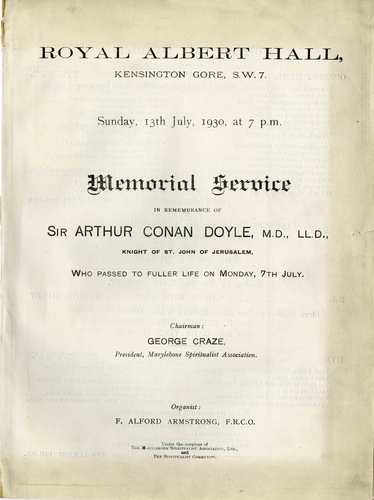 "'MEMORIAL SERVICE FOR SIR A CONAN DOYLE - A memorial service for Sir Arthur Conan Doyle was held last night at the Albert Hall. On the platform were Lady Conan Doyle, with a vacant chair on her right labelled 'Sir Arthur Conan Doyle', Mr Dennis Doyle, Mr Adrian Doyle, Miss Mary Doyle, and Mrs Estelle Roberts. Mr George Craze presided. A telegram from Sir Oliver Lodge was read, and tributes to Sir Arthur were paid in short addresses by the Rev G Vale Own, the Rev C Drayton Thomas, Mr H E Hunt, and Mr Ernest Oaten." (The Times, 14 July 1930)