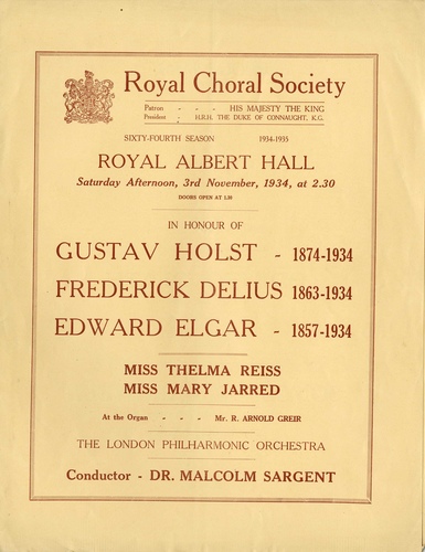 | Set List | National Anthem: 'God Save the King' 'The Planets - Mrs, Venus and Jupiter', Holst (London Philharmonic Orchestra), 'Ode To Death, Op.38', Holst (London Philharmonic Orchestra, Royal Choral Society) 'Songs of Farewell', Delius (London Philharmonic Orchestra, Royal Choral Society) 'Cello Concerto', Elgar (London Philharmonic Orchestra, Thelma Reiss) 'The Music Makers', Elgar (London Philharmonic Orchestra, Royal Choral Society, Mary Jarred) |
