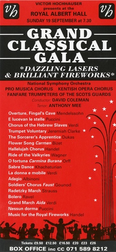 | Set List | 'Overture' from The Hebrides, Op.26, Mendelssohn (National Symphony Orchestra), 'E Lucevan Le Stelle' from Tosca, Puccini (Anthony Mee, National Symphony Orchestra), 'Va Pensiero' from Nabucco, Verdi (Pro Musica Chorus of London, Kentish Opera Chorus, National Symphony Orchestra), 'Trumpet Voluntary', Clarke, arr. Wood (National Symphony Orchestra), Scherzo - 'The Sorcerer's Apprentice', Dukas (National Symphony Orchestra), 'Flower Song' from Carmen, Bizet (Anthony Mee, National Symphony Orchestra), 'Hallelujah Chorus' from Messiah, Handel (Pro Musica Chorus of London, Kentish Opera Chorus, National Symphony Orchestra), 'The Ride of the Valkyries' from Die Walkure, Wagner (National Symphony Orchestra), 'Grand March' from Aida, Verdi (Pro Musica Chorus of London, Kentish Opera Chorus, National Symphony Orchestra) INTERVAL 'O Fortuna' from Carmina Burana, Orff (Pro Musica Chorus of London, Kentish Opera Chorus, National Symphony Orchestra), 'Sabre Dance' from Gayaneh, Khachaturian (National Symphony Orchestra), 'La Donna e Mobile' from Rigoletto, Verdi (Anthony Mee, National Symphony Orchestra), 'Adagio in G Minor for Strings and Organ', attr. Albinoni (National Symphony Orchestra), 'Soldiers' Chorus' from Faust, Gounod (Pro Musica Chorus of London, Kentish Opera Chorus, National Symphony Orchestra), 'Radetzky March', J Strauss I (National Symphony Orchestra), 'Nessun Dorma' from Turandot, Puccini (Anthony Mee, National Symphony Orchestra), 'Bolero', Ravel (National Symphony Orchestra), 'Music for the Royal Fireworks', Handel (National Symphony Orchestra) |
