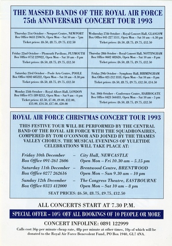| Set List | 'Fanfare on the RAF Call', 'God Save the Queen' (The National Anthem), Flourish - 'Knights of the Air', Barrie Hingley, Poem - 'High Flight', John Magee, Prelude - 'The Spitfire', Walton, Quick March - 'Cavalry of the Clouds', Alford, Song March - 'The Army, Navy and Air Force', Darewski, Lockton (Band Technician Matthew Little), From the Suite 'Conquest of the Air' 'The Wind', 'Gliding', 'Stunting', Bliss, arr. Hingley, Trumpet Trio - 'Buglers Holiday', Leroy Anderson (Junior Technician Matthew Peck, Junior Technician Paul Sutton, Junior Technician Simon Carter), '1st Movement from Flute Concerto', Ibert, arr. I Heron (Fl.-Sgt. Kenneth Bell), Clarinet Feature - 'Clarinet Candy', Leroy Anderson (Women Junior Technicians), 'A Salute to British Songs', arr. Stuart Stirling (Emer McParland, Junior Technician Matthew Little), Descriptive - 'Battle for Freedom', David Richards, Concert March - 'Imperial March', Elgar INTERVAL March - 'The Dam Busters', Coates, Excerpts from 'Coastal Command Suite' - 'U-Boat Alert', 'Taking Off at Night', 'The Hudson's Take Off from Iceland', Vaughan Williams, arr. Hingley, 'The Pathfinders', Malcolm Lockyer, 'Colditz', Robert Farnon, 'Reach for the Sky', John Addison, 'Supergirl', Jerry Goldsmith, arr. Stuart Kelley, 'The Big Band Years', Emer McParland (RAF Squadronaires), 'The Vision of Leonardo da Vinci', from Conquest of the Air, Bliss, Poem - 'Lie in the Dark', Coward, 'The Call of the Trumpet', Hingley, 'Jerusalem', Parry (Junior Technician Matthew Little), 'Pomp and Circumstance No.1' (Land of Hope and Glory), Elgar, 'RAF March Past', Davies, Dyson |