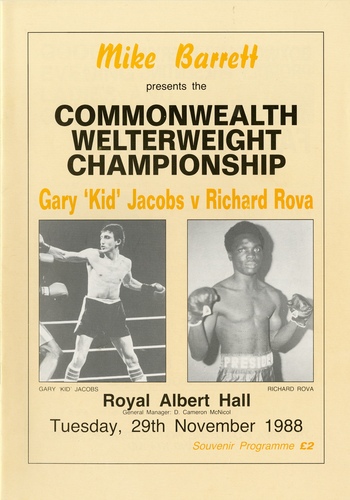 | Set List | Middleweight - Anthony 'The Terminator' Logan (Miami,USA) v Carlton Warren (Battersea), Commonwelth Welterweight - Gary 'Kid' Jacobs (Swiss Cottage) v Richard Rova (Zimbabwe), Commonwealth Welterweight - Derek 'Sweet D' Williams (Battersea) v Young Haumona (Tonga), Light-Middleweight - Ian Strudwick (Hockley) v Mark Howell (Nottingham), Featherweight - Joe Rafiu King Jnr. (Canning Town) v John Bennie (Scotland), Welterweight - Mickey Lloyd (Acton) v Kevin Hayde (Cardiff, Wales) |