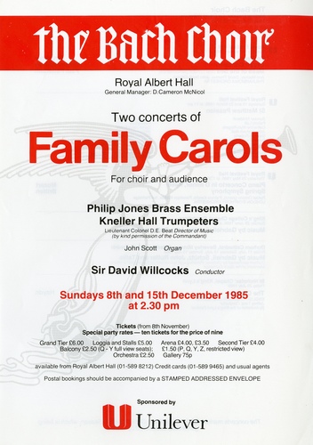 | Set List | 'Fanfare' leading into 'O Come, All Ye Faithful' (The Bach Choir), 'Sussex Carol' (The Bach Choir), 'Blessed be That Maid Mary' (The Bach Choir), 'Ding Dong! Merrily on High' (The Bach Choir), 'God Rest You Merry' (The Bach Choir), 'When Christ was Born' (The Bach Choir), 'While the Shepherds Were Watching' (The Bach Choir), 'In Dulci Jubilo' (The Bach Choir), 'Music for His Majesty's Cornetts and Sackbutts', Matthew Locke (Philip Jones Brass Ensemble), 'Unto Us is Born a Son' (The Bach Choir), 'All My Heart This Night Rejoices' (The Bach Choir), 'Nativity Carol' (The Bach Choir), 'Resonemus Laudibus' (The Bach Choir), 'The First Nowell' (The Bach Choir), 'O Little Town of Bethlehem' (The Bach Choir), 'Donkey Carol' (The Bach Choir), 'Deck the Hall' (The Bach Choir), 'Gloria' (1st movt.), John Rutter (The Bach Choir) INTERVAL 'Once in Royal David's city' (The Bach Choir), 'Star Carol' (The Bach Choir), 'Away in a Manger' (The Bach Choir), 'Birthday Carol' (The Bach Choir), 'Good King Wenceslas' (The Bach Choir), 'Hornucopia', Duncan Beat (Philip Jones Brass Ensemble, Trumpeters of Kneller Hall), 'The Twelve Days of Christmas' (The Bach Choir), 'We Wish You a Merry Christmas' (The Bach Choir), 'Hark! The Herald Angels Sing' (The Bach Choir), 'Fanfare' (Trumpeters of Kneller Hall) |