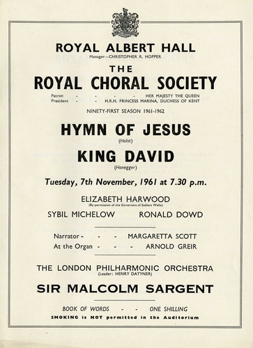 | Set List | 'God Save the Queen', arr. Elgar, (National Anthem), 'The Hymn of Jesus', Holst (Royal Choral Society), 'King David', Honegger (Margaretta Scott, Elizabeth Harwood, Sybil Michelow, Ronald Dowd, Royal Choral Society) |