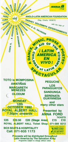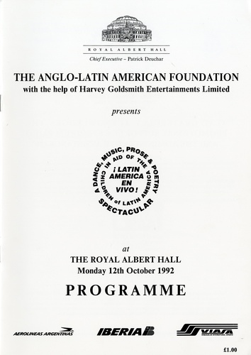 | Set List | Olodum, Yumba de Cumbas (Peguche), Aricuchicos (Peguche), Inti Raymi (Peguche), Readings (H.E. Dr. Mauricio Rosales, Nickolas Grace), Ronda de Los Guayacanes (Dancers from Panama), El Punto (Dancers from Panama, Lagrima Rios), Reading (Ann Morrish, Grupo Delaire), Reading (Nickolas Grace), Danza de las Tijeras (La Escuela Nacional de Folklore - Jose Maria Arguedas (Los Hermanos Chiara, Margareth Menezes, Olodum) INTERVAL Mariachi Azteca, Serenata Guayanesa Reading (John Castle, Teddy Peiro Tango Group & Los Tangueros, Awatinas), Reading (Michael Maloney, Los Paraguayos, Sandunga, Toto La Momposina), Finale - A Song for the 'Children of the Americas', Davide Mantovani, Pedro Rojas |