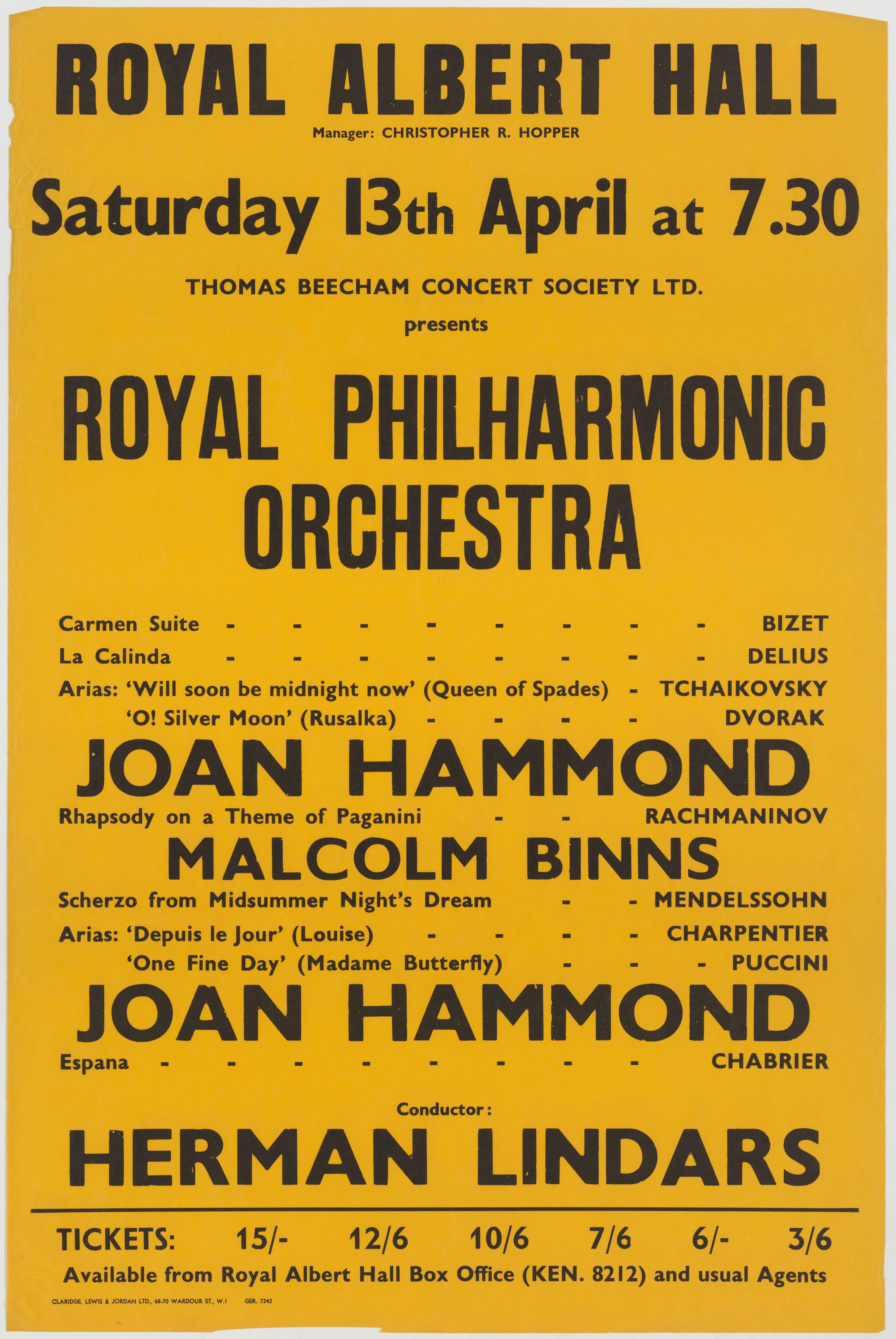 | Set List | 'Overture' from Le Corsaire, Berlioz (Royal Philharmonic Orchestra), 'La Calinda' from Koanga, Delius (Royal Philharmonic Orchestra), Suite from 'Carmen', Bizet (Royal Philharmonic Orchestra), Arias - 'Twill Soon Be Midnight Now' from Queen of Spades, Tchaikovsky (Joan Hammond, Royal Philharmonic Orchestra), 'O! Silver Moon' from Rusalka, Dvorak (Joan Hammond, Royal Philharmonic Orchestra), 'Rhapsody on a Theme of Paganini, Op.41', Rachmaninoff (Malcolm Binns, Royal Philharmonic Orchestra), 'Scherzo' from A Midsummer Night's Dream, Mendelssohn (Royal Philharmonic Orchestra), Arias - 'Depuis Le Jour' from Louise, Charpentier (Joan Hammond, Royal Philharmonic Orchestra), 'One Fine Day' from Madama Butterfly, Puccini (Joan Hammond, Royal Philharmonic Orchestra), Rhapsody - 'Espana', Chabrier (Royal Philharmonic Orchestra) |