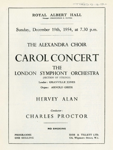 | Set List | 'Fanfare for Christmas Day', Martin Shaw, 'Christmas is Coming', arr. Walford Davies (Alexandra Choir), Czech Carol - 'Four Folk Song Carols' (Alexandra Choir), Burgundian Carol - 'Patapan' (Alexandra Choir), Irish Carol - 'Christmas Day is Come' (Alexandra Choir), German Carol - 'Song of The Crib', arr. Vaughan Williams (Alexandra Choir), 'The Shepherd's Song', Vaughan Williams (Alan), 'A Virgin Mother', arr. Gerald Cockshott (Alan), 'He Is Born, The Child Divine', arr. Gerald Cockshott (Alan), Encore - 'The Clown Song', D McMahon (Alan), Unison Song - 'A Song for Christmas', King Charles I ,arr. Maurice Jacobson (Alexandra Choir), French Carol - 'Waking Time', arr. Proctor (Alexandra Choir), Sussex Carol - 'On Christmas Night', arr. Vaughan Williams (Alexandra Choir), Epiphany Carol - 'The Kings', Cornelius, arr. Proctor (Alexandra Choir), Traditional Carol - 'I Saw Three Ships', arr. Charles Kennedy Scott (Alexandra Choir), Choral Prelude - 'Es Ist Ein' Ros' Entsprungen', Brahms, arr. Proctor (London Symphony Orchestra), Northumbrian Tune - 'Hush! My Dear, Lie Still and Slumber', arr. Martin Shaw (Alexandra Choir), Carol - 'Good King Wenceslas' (Alexandra Choir), Motet - 'An Endless Alleluia', C S Lang (Alexandra Choir), Two Legends - 'The Miraculous Harvest', Vaughan Williams (Alexandra Choir), 'The Crown of Roses', Tchaikovsky (Alexandra Choir), Traditional Carol - 'Chanticleer', arr. Martin Shaw (Alexandra Choir), Carol - 'The Twelve Days of Christmas', arr. Frederick Austin (Alexandra Choir), Carol - 'God Rest You Merry, Gentlemen' (Alexandra Choir), Songs - 'Come, Gentle Shepherds', arr. Henry G Ley (Alan), 'Star Candles', Michael Head (Alan), 'The Oxen', C Armstrong Gibbs (Alan), 'King Herod And The Cock', arr. Cecil J.Sharp (Alan), Carol - 'Past Three O'Clock', arr. Charles Wood (Alexandra Choir), Choral Song - 'Zion's Children', arr. Ley (Alexandra Choir), 'Ye Watchers And Ye Holy Ones', arr. Oldroyd (Alexandra Choir) |