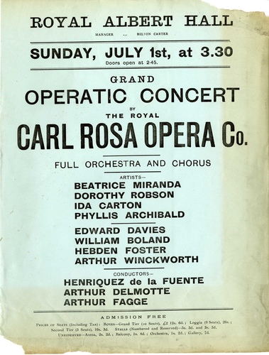 | Set List | Overture: 'Merry Wives of Windsor', Nicolai (Arthur Delmotte), Chorus: 'Hail Bright Abide' from Tannhauser, Wagner (Arthur Delmotte), Scena: 'Lohengrin Narration', Wagner (William Boland, Henriquez de la Fuente), Aria: 'Air des Adieu' from Jean D'Arc, Tchaikovsky (Ida Carton, Arthur Fagge), Solo and Chorus: 'O Isis and Osis' from Magic Flute, Mozart (Arthur Winckworth, Arthur Fagge), Aria: 'Ritorna Vicitor' from Aida, Verd (Beatrice Miranda, Arthur Fagge), Aria: 'Celesta Aida' from Aida, Verdi (Edward Davies, Arthur Fagge), Aria: 'Softly Awakes My Heart' from Samson and Delilah, Saint-Saens (Phyllis Archibald, Arthur Fagge), Quartette: 'Un Di Si B' from Rigoletto, Verdi (Beatrice Miranda, Phyllis Archibald, Edward Davies, Hebden Foster, Henriquez de la Fuente), Aria: 'Dove Song' from Figaro, Mozart (Dorothy Robson, Henriquez de la Fuente), Song: 'Prolouge' from Pagliacci, Leoncavallo (Hebden Foster, Henriquez de la Fuente), Aria: 'Qui Sdegno' from Magic Flute, Mozart (Arthur Winckworth, Henriquez de la Fuente), Selection: (From 2nd Act of Hoffman), Offenbach (Beatrice Miranda, Ida Carton, Edward Davies, Hebden Foster, Henriquez de la Fuente), 'God Save save the King' |