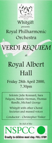 | Set List | 'Dona Nobis Pacem', David Fanshawe (Natalie Herman, Whitgift Choristers, Whitgift Choral Society, Massed Choirs of Cumnor House, Elmhurst, The Lodge, Margaret Roper, Old Palace, Prospect House, Rosemead, St Chads and Whitgift), 'Messa da Requiem', Verdi (Julie Kennard, Sara Fulgoni, Thomas Randle, Michael George, Whitgift Choristers, Whitgift Choral Society, Massed Choirs of Croydon High, Old Palace and Whitgift) INTERVAL 'Canon in D', Pachelbel (The Whitgift String Orchestra with Coloma, Croham Hurst, Croydon High and guests), 'Songs from Adiemus', Karl Jenkins (The Whitgift Orchestra with Croham Hurst, Croydon High and guests, The massed choirs of Whitgift and Croham Hurst with guests) |