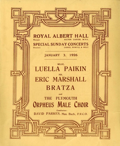 | Set List | Part-Songs: 'Song of The Bards', Harrison (Plymouth Orpheus Male Choir), 'Dance of The Gnomes', MacDowell (Plymouth Orpheus Male Choir), 'Feasting, I Watch', Elgar (Plymouth Orpheus Male Choir), Aria: 'Qui La Voce' (Puritani), Bellini (Luella Paikin), Violin Solo: 'Concerto in E Minor', Mendelssohn (Bratza) Aria: 'Blick Ich Umher' (Tannhauser), Wagner (Eric Marshall), Part-Song: 'When Twilight Dews', David Parkes (Plymouth Orpheus Male Choir), Choral Ballad: 'The Phantom Host', Hegar (Plymouth Orpheus Male Choir), Aria: 'Bell Song' (Lakme), Delibes (Luella Paikin), Songs: 'Du Bist die Ruh', Schubert (Eric Marshall), 'Erl Konig', Schubert (Eric Marshall), Aria: 'Caro Nome' from Rigoletto, Verdi (Luella Paikin), Part-Songs: 'Full Fathom Five', Dunhill (Plymouth Orpheus Male Choir), 'John Peel', arr. Mark Andrews (Plymouth Orpheus Male Choir) |
