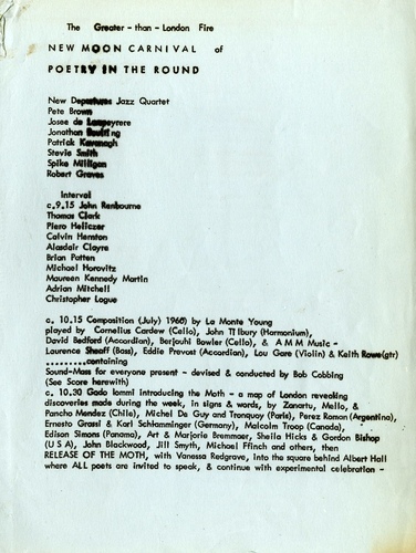 | Performance Notes | The New Moon Carnival of Poetry in The Round brought together over 30 of the most active, alternative poets of the age, and is now considered the birth of English underground scene. An audience of some 2,500 flocked to the event to hear performers including Michael Horovitz, Spike Milligan, Brian Patten and Vanessa Redgrave.