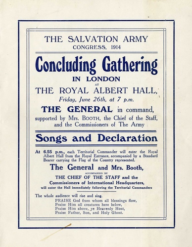 | Main Performers | General Bramwell Booth, Mrs Bramwell Booth, Chief of Staff, Commisioners of The Army - speakers |
