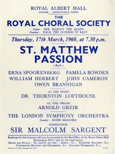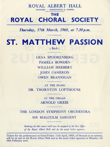 | Main Performers | Erna Spoorenberg, Pamela Bowden, William Herbert, John Cameron, Owen Brannigan - vocals, Dr Thornton Lofthouse - pianoforte, Arnold Greir - organ |