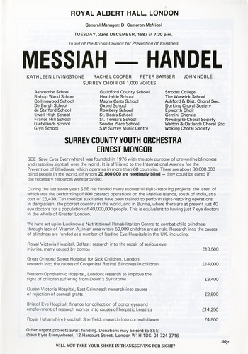 | Choirs | Surrey Choir of 1,000 Voices: Ashcombe School, Bishop Wand School, Collingwood School, De Burgh School, de Stafford School, Ewell High School, France Hill School, Glebelands School, Glyn School, Guildford County School, Heathside School, Magna Carta School, Oxted School, Rosebery School, St. Bedes School, St. Teresa's School, Sondes Place School, South West Surrey Music Centre, Strodes College, The Warwick School, Ashford and District Choral Soc, Dorking Choral Society, Epworth Choir, Gemini Chorale, Newdigate Choral Society, Walton and Oatlands Choral Society, Woking Choral Society |