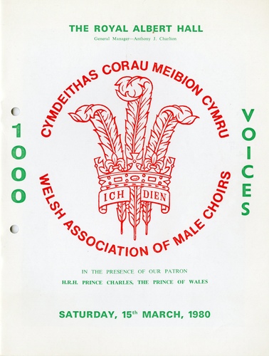 | Choirs | 1000 Welsh Voices: Cor Meibion Aberafan Abertillery Orpheus Male Choir Aber Valley Male Voice Choir The Afan Glee Society Blaenavon Male Voice Choir Cor Meibion Cwmann A'r Cylch Cwm Male Choir Cor Meibion Glynnedd The Gwalia Singers Swansea Gwent Police Choir Cor Meibion Llandybie Cor Meibion Mynydd Mawr Cor Meibion Maesteg A'r Cylch Newport Male Voice Choir Cor Meibion Pontypridd Resolven Male Choir Rhos 'Cwmtawe' Male Choir Tenby Male Choir Whitland and District Male Choir Ystrad Mynach Male Choir |