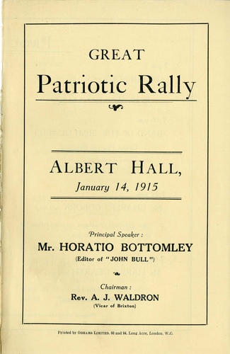 | Performance Notes | "The Albert Hall was crowded last night at what was described as a 'great Patriotic rally' organised by the Business Government League. The Rev A J Waldron, vicar of Brixton, presided, and on a 'Patriotic platform' were wounded, soldiers, sailors, members of the Sportsman's and Footballers' Battalions and the Legion of Frontiersmen. Red Cross nurses, Boy Scouts, special constables, and Chelsea pensioners. Patriotic songs by Mr Charles Coborn and Mr Leo Dryden, recitations by Miss Constance Collier, and selections by the band of the Irish Guards preceded the meeting. The crush was so great that Mr Horatio Bottomley, the principal speaker, was unable to fight his way in until the chairman had spoken. Mr Bottomley said that this was not the time for criticism, but when the time came many scandals would be inquired into with regard to the equipping, paying, and camping out recruits, and other things, and that he should not hesitate to insist upon the trial by Court-martial of every man who had taken advantage of the country's trouble to line his filthy pockets with gold at the expense of the soldier. We were not doing as well as we should with recruiting. Did they realize that three-quarters of Lord Kitchner's army at present consisted of married men? If the single men did not come forward in larger numbers than they were doing, it would not be long before, either by Act of Parliament or by the operation of the Common Law, they would be compelled to come and do what it ought to be their proudest privilege to rush to do of their own accord." (The Times, 15 January 1915)