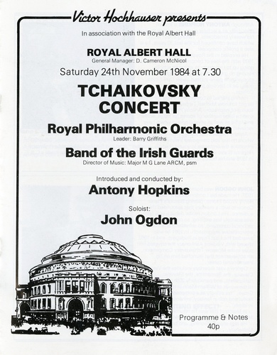 | Set List | 'Waltz from Symphony No.5 in E Minor, Op.64', Tchaikovsky (Royal Philharmonic Orchestra), 'Swan Lake Suite', Tchaikovsky (Royal Philharmonic Orchestra), 'Piano Concerto No.1 in B Flat Minor, Op.23', Tchaikovsky (John Ogdon, Royal Philharmonic Orchestra), INTERVAL 'Nutcracker Suite', Tchaikovsky (Royal Philharmonic Orchestra), '1812 Overture, Op.49', Tchaikovsky (Royal Philharmonic Orchestra, Band of the Irish Guards) |