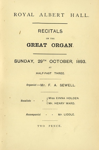 | Main Performers | Miss Einna Holden, Mr Henry Ward - vocals, F A Sewell - organ |