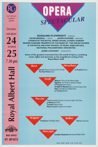 | Set List | 'March' from La Prophete, Meyerbeer (National Philharmonic Orchestra), 'Va Pensiero' from Nabucco, Verdi (Chorus of the Royal Opera House, National Philharmonic Orchestra), 'Scorrendo Uniti Remota' from Rigoletto, Verdi (Chorus of the Royal Opera House, National Philharmonic Orchestra), 'Questa o quella' from Rigoletto, Verdi (David Rendall, National Philharmonic Orchestra), 'Vieni, t'affretta' from Macbeth, Verdi (Rosalind Plowright, National Philharmonic Orchestra), 'Entrance and Toreador Song' from Carmen, Bizet (Andre Cognet, National Philharmonic Orchestra), 'Au Fond du Temple Saint' from The Pearl Singers, Bizet (David Rendall, Andre Cognet, National Philharmonic Orchestra), 'Anvil Chorus' from Il Trovatore, Verdi (Chorus of the Royal Opera House, National Philharmonic Orchestra), 'Ecco L'orrido Campo' from Un Ballo in Maschera, Verdi (Rosalind Plowright, National Philharmonic Orchestra), 'Non Sai Tu Che Se L'anima Mia' from Un Ballo in Maschera, Verdi (Rosalind Plowright, David Rendall, National Philharmonic Orchestra), 'Grand March' and 'Ballet Music' from Aida, Verdi (Chorus of the Royal Opera House, Fanfare Trumpeters of the Royal Military School of Music, Massed Fanfare Trumpets of the Band of the Welsh Guards, National Philharmonic Orchestra) INTERVAL 'Freudig Begrussen' from Tannhauser, Wagner (Chorus of the Royal Opera House, National Philharmonic Orchestra), 'Recondita Armonia' from Tosca, Puccini (David Rendall, National Philharmonic Orchestra), 'E Lucevan le Stelle' from Tosca, Puccini (David Rendall, National Philharmonic Orchestra), 'Vissi D'arte' from Tosca, Puccini (Rosalind Plowright, National Philharmonic Orchestra), 'Intermezzo' from Cavalleria Rusticana, Mascagni (National Philharmonic Orchestra), 'Easter Hymn' from Cavalleria Rusticana, Mascagni (Rosalind Plowright, Chorus of the Royal Opera House, National Philharmonic Orchestra), 'Ah, Mimi, Tu Piu Non Torni' from La Boheme, Puccini (David Rendall, Andre Cognet, National Philharmonic Orchestra), 'Nessun Dorma' from Turandot, Puccini (David Rendall, National Philharmonic Orchestra), 'Casta Diva' from Norma Bellini (Rosalind Plowright, Chorus of the Royal Opera House, National Philharmonic Orchestra), 'Brindisi' from La Tarviata, Verdi (Rosalind Plowright, David Rendall, Chorus of the Royal Opera House, National Philharmonic Orchestra) |