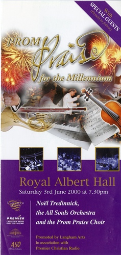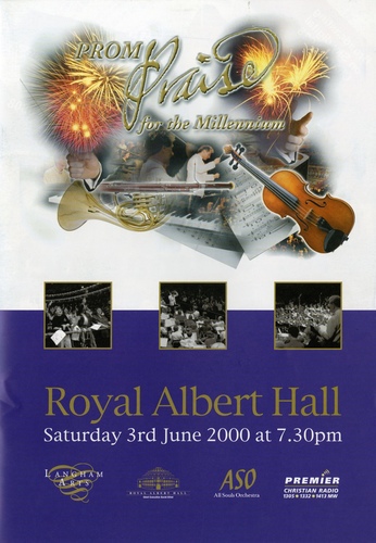 | Choirs | The African Children's Choir, Massed Prom Praise Choir: All Souls, Langham Place, All Saints, Lindfield, Balham Baptist, Beckenham URC, Bromley Baptist, Christ Church, Bexley Heath, Christ Church, Bromley, Christ Church, Old Kent Road, Christ Church, Orpington, Court Farm Evangelical, Enfield Baptist, Frimley Baptist, Frinton Free, Gold Hill Baptist, Gunnersbury Baptist, Holy Trinity, Claygate, Holy Trinity, Hatfield Heath, Holy Trinity, Lane End, Hook Evangelical Church, Surbiton, Kenton Baptist, Marlow Methodist, Milton Keynes Chorale, Music in Worship Foundation, Oxford, Nork Community, Oakwood Chapel and St. Mary's, Hounslow, Rye Lane Chapel, St. Barnabas, Linslade, St. Dunstan's, Mayfield, St. James', Woodley, St. John's, Welling, St. Luke's, West Norwood, St. Mary's, Harlow, St. Marys, Hayes, St. Mary's, Osterley, St. Mary's, Sheering, St. Mary's, Watford, St. Michael's. Braintree, St. Nicholas, Sevenoaks, St. Nicholas, Witham, St. Neots Evangelical, St. Paul's, Cheam, St. Paul's, Finchley, St. Peter's, St Helier, Morden, The Coign Church, Woking, Tooting URC, Uxbridge Parish, West Road, Bury St Edmunds, Wormley Free |