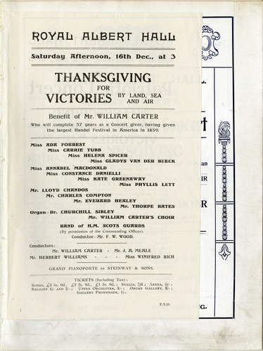 | Set List | 'National Anthem' (Choir, Band, Churchill Sibley, F W Wood), Thanksgiving Anthem: 'Let the People Praise Thee, O God', William Carter (Choir, Ada Forrest, Phyllis Lett), Air: 'Let the Bright Seraphim' (Samson), Handel (Constance Danielli, Frank James), 'The Death of Nelson', Braham (Charles Compton), Songs of a Vivandiere: 'Reveille', Herbert Oliver (Carrie Tubb), 'On the March', Herbert Oliver (Carrie Tubb), 'The Young Warrior', H T Burleigh (Thorpe Bates), 'Land of Hope and Glory', Elgar (Phyllis Lett, Choir, Band), Solo and Chorus: 'The Call of the Motherland', Churchill Sibley (Lloyd Chandos) [PAGES 9-10 MISSING] 'Darling Soldier Boy!', Cameron Scott (Gladys Van Der Beeck, Band), 'The Soldier's Tear', Alexander Lee (Kate Greenaway), 'Angus Macdonald', Roeckel (Annabel MacDonald), 'Sweet As Her Roses' (A Song of England), Frederick H Cowen (Helena Spicer), 'Hearts of Oak', Dr Boyce (Everard Healey), Patriotic Song: 'Monarch of Empire', Churchill Sibley (Choir, Band, Churchill Sibley) INTERVAL National Song: 'For Home and Empire', William Carter (Choir, Band), 'Break o' Day', Sanderson (Carrie Tubb), 'The Sailor's Grave', Sullivan (Charles Compton), 'Sonny', Arthur Meale (Ada Forrest), 'Plymouth Hoe' (Drakes Drum), Lady Barrett Lennard (Thorpe Bates), 'The Glory of the Sea', Sanderson (Phyllis Lett), 'Home Sweet Home', Bishop (Gladys Van Der Beeck), 'My Heart's In My Homeland', Kennedy Russell (LC), 'When You Come Home', W H Squire (Annabel MacDonald), 'A Soldier For Me', Alicia Adelaide Needham (Helena Spicer), Duet: 'O Lovely Peace' (Judas Maccabeus), Handel (Constance Danielli, Kate Greenaway), 'The Lowland Sea' (Old Sea Song), arr. Edward Branscombe (Everard Healey), Chorus: 'Rule Britannia', arr William Carter (Choir, Band, Churchill Sibley) |