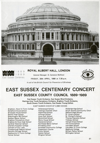 | Choirs | East Sussex Choir of 2,000 Voices: Brighton, Hove VI Form College, Beresford House School, Brickwall House School, Bexhill High School, Blatchington Mill School, Bodiam Manor School, Brighton Polytechnic Choir, Brighton and Hove High School, Cardinal Newman School, Charters-Ancaster College, Convent of Our Lady, Crowborough Beacon School, Dorothy Stringer School, Eastbourne VI Form College, Falmer School, Helenswood School Hastings Chamber Choir Heathfield School Hillcrest School Hove Park School Micklefield School Moira House School Newlands School Northease Manor School, Pinneberg Choir, Portslade Community College, Preparatory Course, Priory School, Ratton School, Ringmer School, Robertsbridge School, South Downs Community Choir, Seaford Head School, St. Anne's School, St. Richard's School, Thomas Peacocke School, Tideway School, Temple Grove School, The Grove School, Varndean School, Varndean VI Form College, Wadhurst College, William Parker School, Willingdon School |