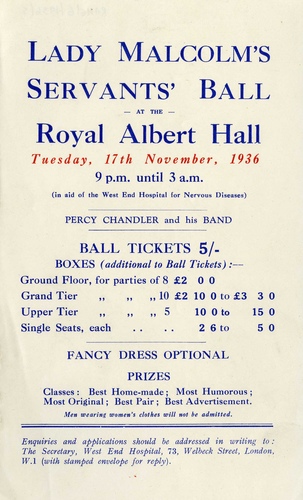 Lady Malcolm was incredibly charming and was the only child of Lilly Langtry, the celebrated actress, beauty and mistress of King Edward 7th. The event's popularity grew so that by 1930 it could fill the vast Albert Hall, which could hold up to 10,000 people for a ball. Lady Malcolm specified fancy dress, so that the servants would not feel embarrassed by not being able to buy expensive dresses or suits for the evening and prizes awarded to the best outfits by celebrity guests. People used their fancy dress to comment on the conditions of their employment by dressing up as cleaning products, alarm clocks, and even as the aristocrats they served.