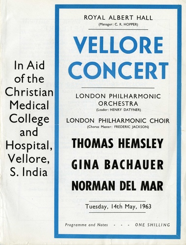 | Performance Title | Vellore Concert - London Philharmonic Orchestra, London Philharmonic Choir, Thomas Hemsley, Gina Bachauer and Norman Del Mar, in aid of The Christian Medical College and Hospital, Vellore, South India |